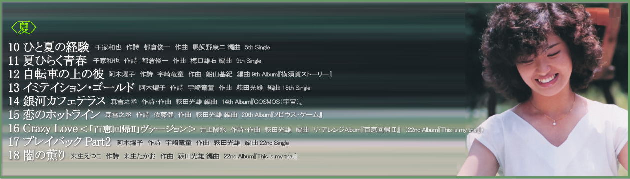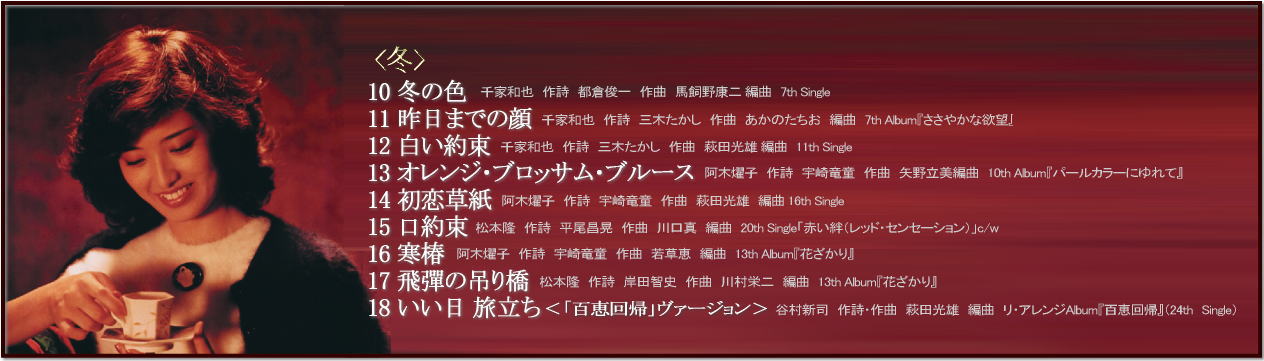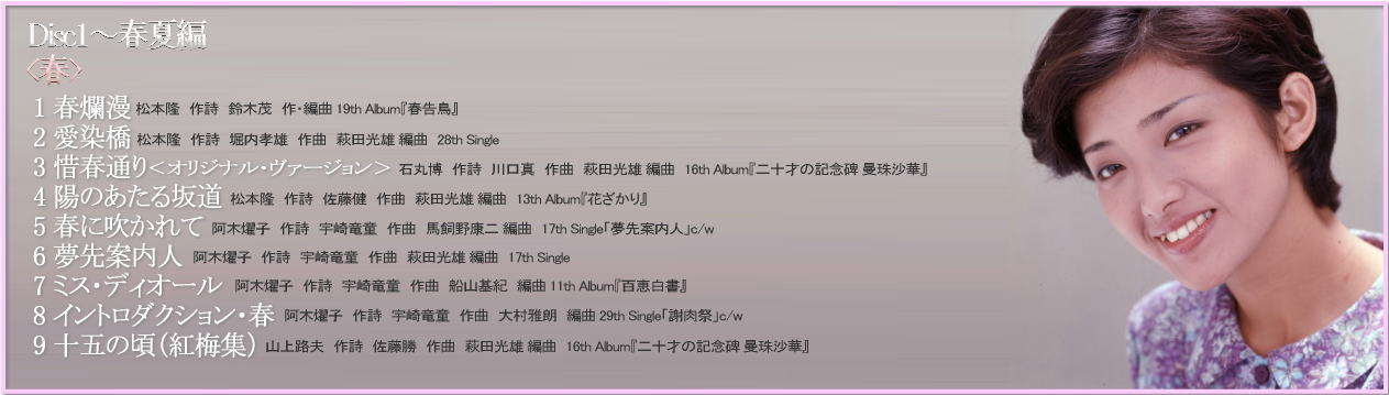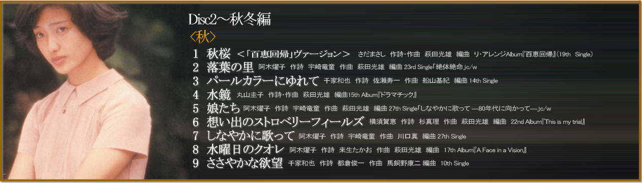 「GOLDEN☆BEST 山口百恵 日本の四季を歌う」は、 「春・夏・秋・冬」、四季をテーマに、シングル、アルバム曲からセレクトされた楽曲で 各季節9曲づつで綴られる新しいアルバムです。 通常のベスト盤のセレクションとは異なる、季節感あふれるセレクトになっている為 アルバム曲は特に、普段ベスト盤にはセレクトされない新鮮な名曲達も数多く並んでいます。 四季それぞれのイメージに合わせてブックレットの写真も綴られた、オールカラーブックレット! 最新デジタル・リマスタリングに、高音質Blu-SpecCD2規格。 高音質で新しく綴られた山口百恵の世界がお楽しみ頂けます! |
