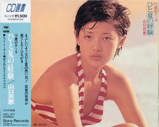 4作目も「世代のテーマ」シリーズ。 盤に針を落とすと「あなたに逢った瞬間、私は何かを感じました。…私は臆病すぎたのです。 愛が…初めての愛が恐かったのです…」の百恵のナレーションから始まり、タイトル曲がフェード・インして来る。 そのあとのAA、B、ラジオ「モモモモ30分」で使用されたACと、メジャーキーの爽やかな作品が並ぶ。 B面の冒頭も百恵のナレーションから始まり、この頃キャンディーズを担当していた穂口雄右、西城秀樹等を書いていたさいとう大三と初起用作家作品が続く。 ラスト2曲にはやはり初起用の作詩家なかにし礼が登場、レコード大賞も受賞した一連の黛ジュン作品のコンビ鈴木邦彦との作品が生まれている。 BAはコンサートでよく歌われていた曲。 封入ポスターはシングル「ひと夏の経験」ジャケットの別カット。 ジャケット撮影:篠山紀信 1986年まで生産。 <テープ> オリジナルフォーマットでは発売されていないが、このアルバムのテープ版として 次の新曲「ちっぽけな感傷」を収録した「ちっぽけな感傷・ひと夏の経験」が9月1日にリリースされている。 アルバム曲中「私を選んで」「朝陽の庭」がカットされ、またナレーションも入っていない。 ![]() SZLH 14(カートリッジ) side A @ ちっぽけな感傷 A 清潔な恋 B 海の友達 side B @ わたしの悩み 誰も知らない A 風になりたい B まぶしい視線 side C @ ひと夏の経験 A 太陽の友達 B 教室を出たら大人 side D @ まばたきの夏 A 恋は…ING(進行形) B バラの誘惑 SKLB 17(カセット) side A @ ちっぽけな感傷 A 清潔な恋 B 海の友達 C わたしの悩み 誰も知らない D 風になりたい E まぶしい視線 side B @ ひと夏の経験 A 太陽の友達 B 教室を出たら大人 C まばたきの夏 D 恋は…ING(進行形)E バラの誘惑 <CD> 91.6.15 SRCL-1871(CD選書)※ナレーションはカットされている 04.5.19 MHCL-10017〜8(HYBRID 紙ジャケット仕様 限定盤)/MHCL-10058(HYBRID通常盤 現行商品) 03.6.4 CD-BOX 「MOMOE PREMIUM」MHCL-251〜74(限定盤) Disc4 07.9.30 CD-BOX 「Complete MOMOE PREMIUM」DQCL-1361〜84(現行商品) Disc4 |
