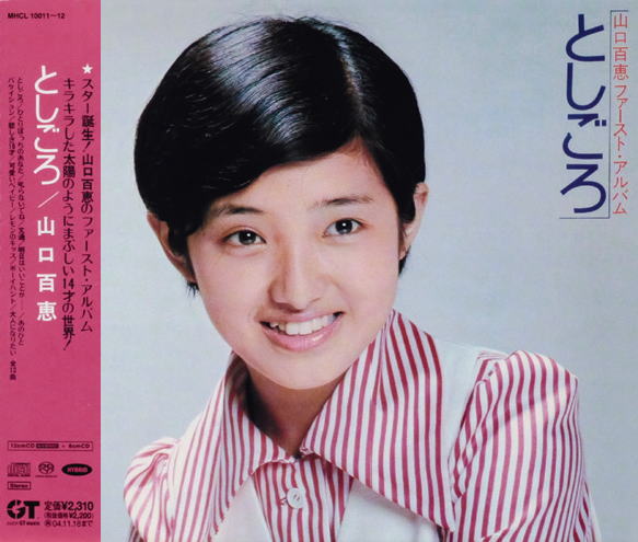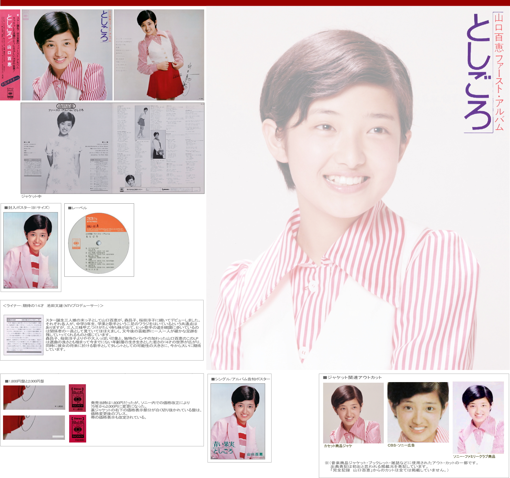 デビューから3ヶ月後にリリースされたファースト・アルバム。 60年代〜70年代の歌謡曲アーティストのアルバムは、シングル曲の他にカヴァーを入れるのが主だった。 ソニーのアイドル達もやはりその傾向にあり、1st〜初期はカヴァーで構成し、全オリジナルは時期を待ってからの場合が多い。 百恵の1stはA面がオリジナル、B面はオールディーズのカヴァーで構成。Wジャケット仕様で内側にはモノクロだが、 次のシングル「青い果実」のジャケットの別カット等がたくさん挿入されている。 発売当時は1,800円だったが、ソニー内での価格改正により75年から2,000円に変更になった。裏ジャケットの右下の部分が白く切り抜かれている盤は、価格変更後のプレス。 ジャケット撮影:立木義浩 1987年まで生産。 <テープ> 80.7.1 25KH-827 オリジナルフォーマットでは発売されていなかったカセットテープが、引退の80年に発売された。表ジャケは微妙な別カット。<CD> 91.6.15 SRCL-1868(CD選書) 04.5.19 MHCL-10011〜2(HYBRID 紙ジャケット仕様 限定盤)/MHCL-10055(HYBRID通常盤 現行商品) 03.6.4 CD-BOX 「MOMOE PREMIUM」MHCL-251〜74(限定盤) Disc1 07.9.30 CD-BOX 「Complete MOMOE PREMIUM」DQCL-1361〜84(現行商品) Disc1 |