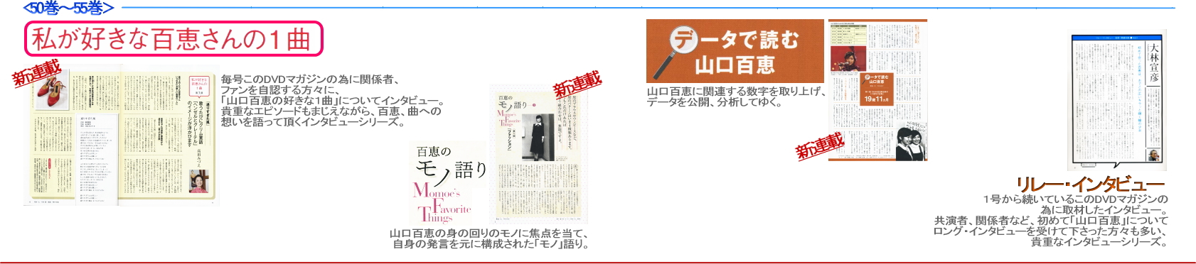 最終号には今秋発売の新刊発表が掲載される予定でしたが、 諸事情により、残念ながら発表中止となりました。 詳しくは講談社オフィシャルページをご覧ください。 『山口百恵「赤いシリーズ」DVDマガジン』は、第55号をもって刊行終了となりました。 |