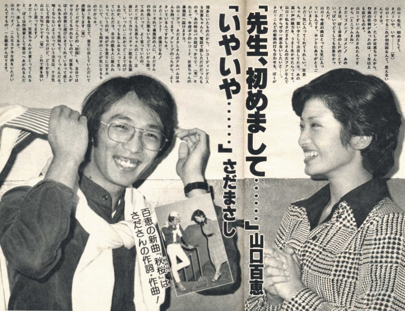 共通の話題とか、全然違う音楽の事とか・・そういう話しながら、それで10ヶ月目くらいですかね「出来た」って いう風に。 僕がまたその時に遊びで足を折っちゃってそれで病院に入院してたんですよ、 それでさださんの曲が出来上がって来たっていうんで、会社の人間にカセット病院まで届けてもらって病院で聴いて 「ああ、いい曲だなぁ〜」それでまた酒井さんなんかと・・、そのときはタイトルが「小春日和」っていうタイトルで メロディも詞もちょっと違ってたんです。 それを酒井さんと電話連絡で「ここのとこ、こういう風にしたいね」ってそれで直しに依頼をして、 出来上がってきて「いい曲だね・・」って。でもB面は?って話になったんですよ。 で「B面作ってない」って言うんですよね。それで「まずいよそれは・・」っていう事になって急遽又さださんに 「実はB面も欲しいんですけど」「えっ、もう1曲ですか!?」みたいになって。 ここから1年かよ・・って思ったんですけど・・ 大 ここから1年!!(爆笑) 川 でもB面はもう1週間以内に作って頂いて。 もうすぐ出来て・・ 大 ああ、そうですか・・・ 「最後の頁」の方もさださん自身がお唄いになってアルバムにも入ってますね。 川 ええ、すごいいい曲書いて貰いましたけど、こんな早く出来るんだったら10ヶ月も待たないで ・・って思ったんですけど(笑) 大 (爆笑)さださんがね、よく「秋桜」の話をする時に「レコーディングの時に百恵ちゃんと会えなくて、電話で話しをした」 と、百恵さんが「この曲をとても好きなんだけど、よく理解出来なくてうまく歌えなくて苦しんでいる」と話をしたと よくさださんがお話なさるんですけれども。 レコーディングの時はスムーズに行かなかったんですか? 川 いや、そんな事ないですよ。唯、多分これキーがすごい音域が広い曲だったんで、2パターン録ってみようって 半音だか一音だか違うやつを同じアレンジなんですけれど録って、両方歌った記憶があるんですよね。 それで高い方がいいって事になって、高い方はファルセットを使うんだけれども百恵はそれまであまりファルセット は使ってなかったんですよ。 大 シングルでは無いですね・・ 川 そうですね、それで使った時に「ああ、すごいいい感じじゃない」って事でキーの高い方にしようっていう事になった